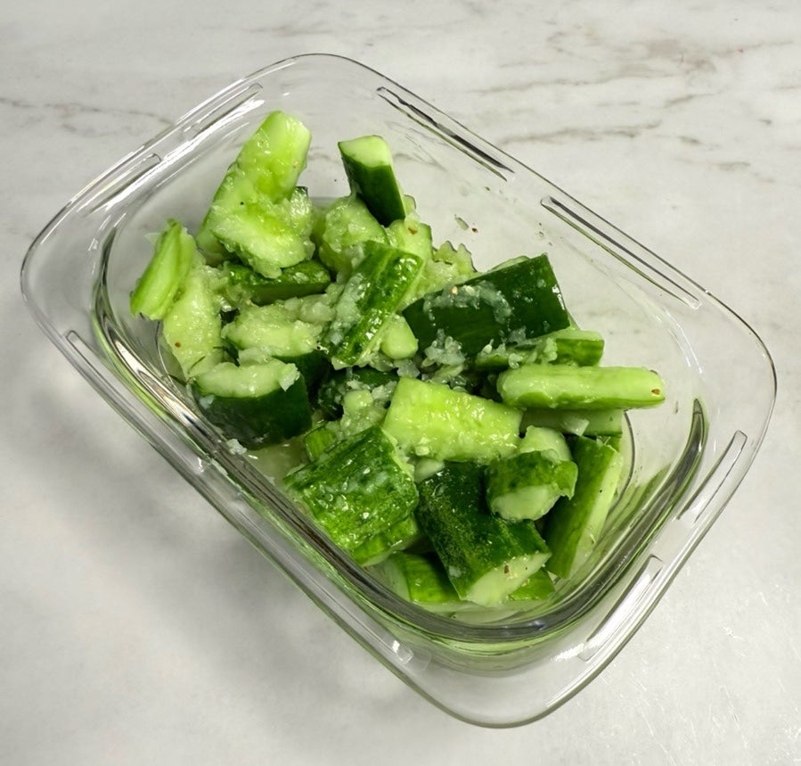 이제 두들겨준 오이를 버무릴 볼에 넣어주면 됩니다. 참고로 가뭄철에 오이가 쓸수도 있습니다.
