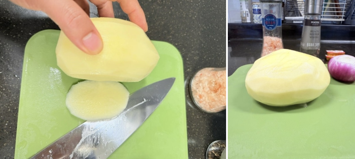 먼저 감자를 써는것이 감자볶음만들기에서 가장 어려운 일입니다. 감자의 밑부분을 이런식으로 살짝 잘라서 도마위에 올렸을때 감자가 흔들거리지 않게 하면 얇게 감자를 썰때도 어려움이 없습니다.