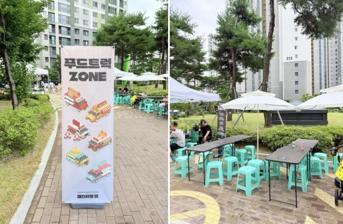푸드트럭 존이 따로 구성 있고 파라솔과 테이블도 있습니다. 보통 이런곳은 행사할때 저런 플라스틱 의자는 주로 빨간색이나 파란색의자가 대부분인데 산뜻하게 민감한 트렌드를 반영한 듯 민트색입니다.