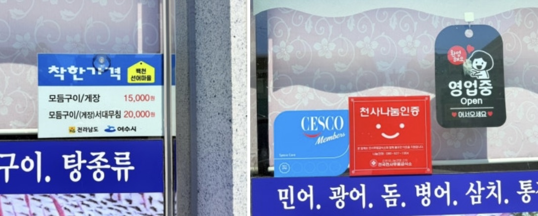 그렇게 도착한 여수 백천선어마을은 착한가격업소점으로 모듬구이와 게장을 단돈 15000원으로 판매중입니다. 더구나 천사사눔인증이라 하니 더욱 더 믿음이 갑니다.