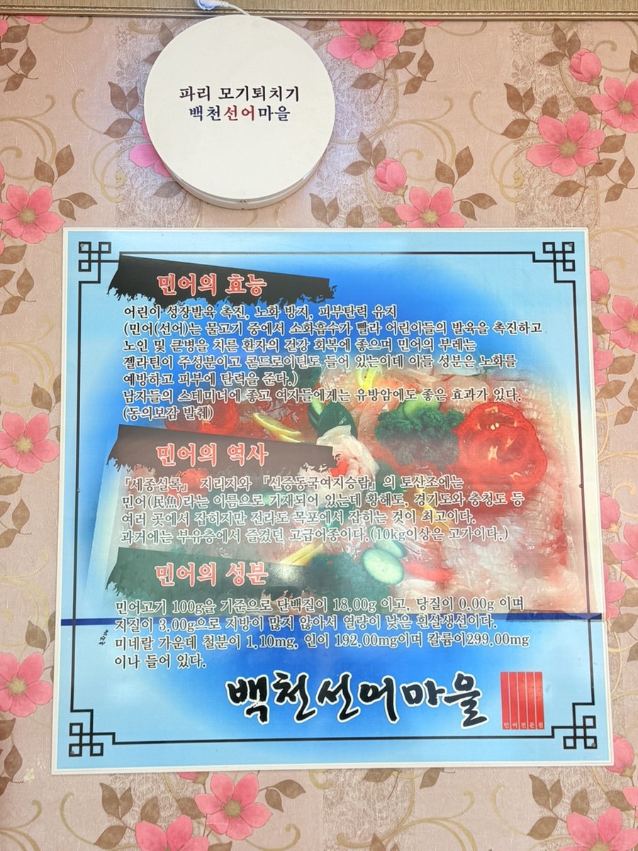 그리고 또 하나 동네 맛집의 기준으로 이렇게 벽 한켠에믄 재료의 효능에 대해서도 크게 걸려 있습니다.