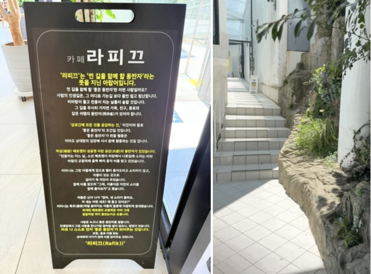 인터넷 기준 카페 라피끄와 라피끄베이커리 두 곳으로 주소가 나오는데 모두 전라남도 여수시 돌산읍 무술목길 142-1로 모두 동일합니다.