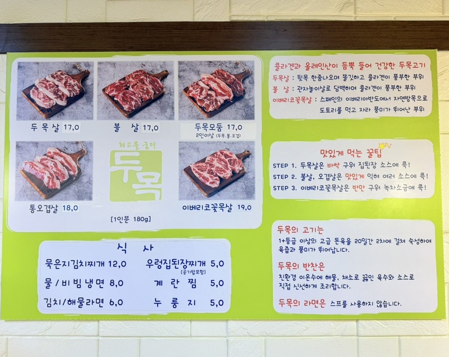 맛집 특징 하나는 벽 한켠에는 큼지막하게 맛보다는 재료의 효능에 대해 쓰여져 있는게 대다수인데 이렇게 다시 보니까 두목살 뜻이 뒷목 한줌 나오는 쫄깃하고 콜라겐이 풍부한 돼지부위라고 합니다.