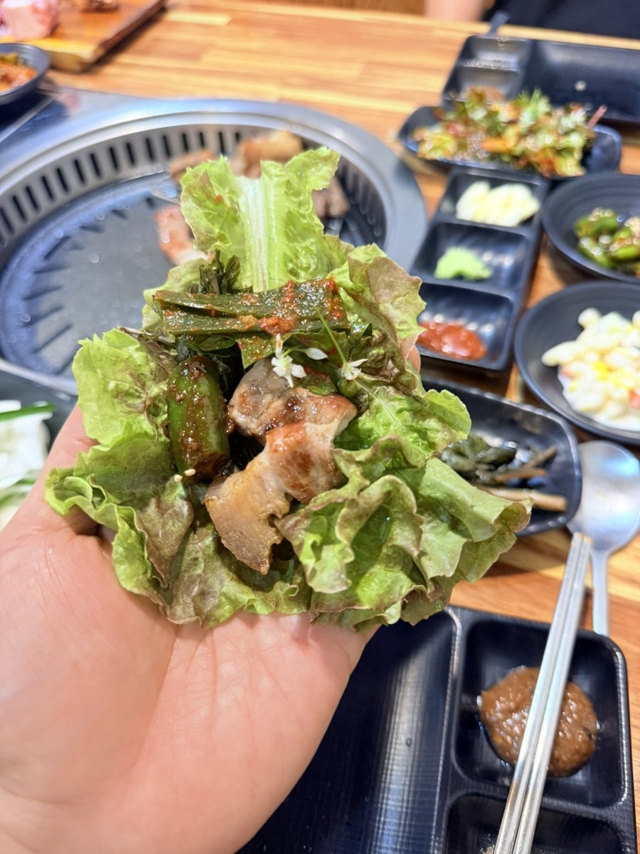 고기쌈이란 역시 모름지기 앞사람 몰래 고기는 2점 깔고 테이블위에 있는 반찬은 전부다 전치 2주 때려 넣고 먹는게 제일 맛있습니다.