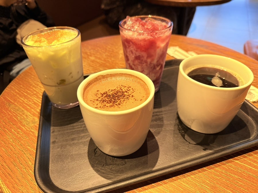 실내 조명 불빛 때문에 약간 색이 좀 그런데 초코렛과 딸기라떼 그리고 멜론라떼, 카페라떼가 나왔습니다. 다른 메뉴는 가끔 종종 마셨기 때문에 평타 이상을 하는데 멜론라떼가 무슨 맛일까 궁금했습니다.