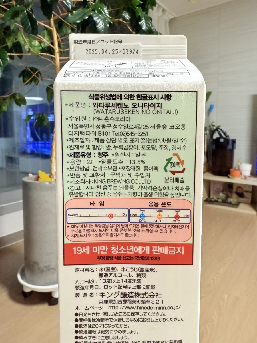 제품명 와타루세켄노 오니타이지이며, 수입원 니혼슈코리아입니다. 원재료는 쌀과 누룩곰팡이,포도당,주정,정제수가 들어가며 제품 유형 청주입니다. (사케 원래 뜻이 일본술이란 뜻입니다)