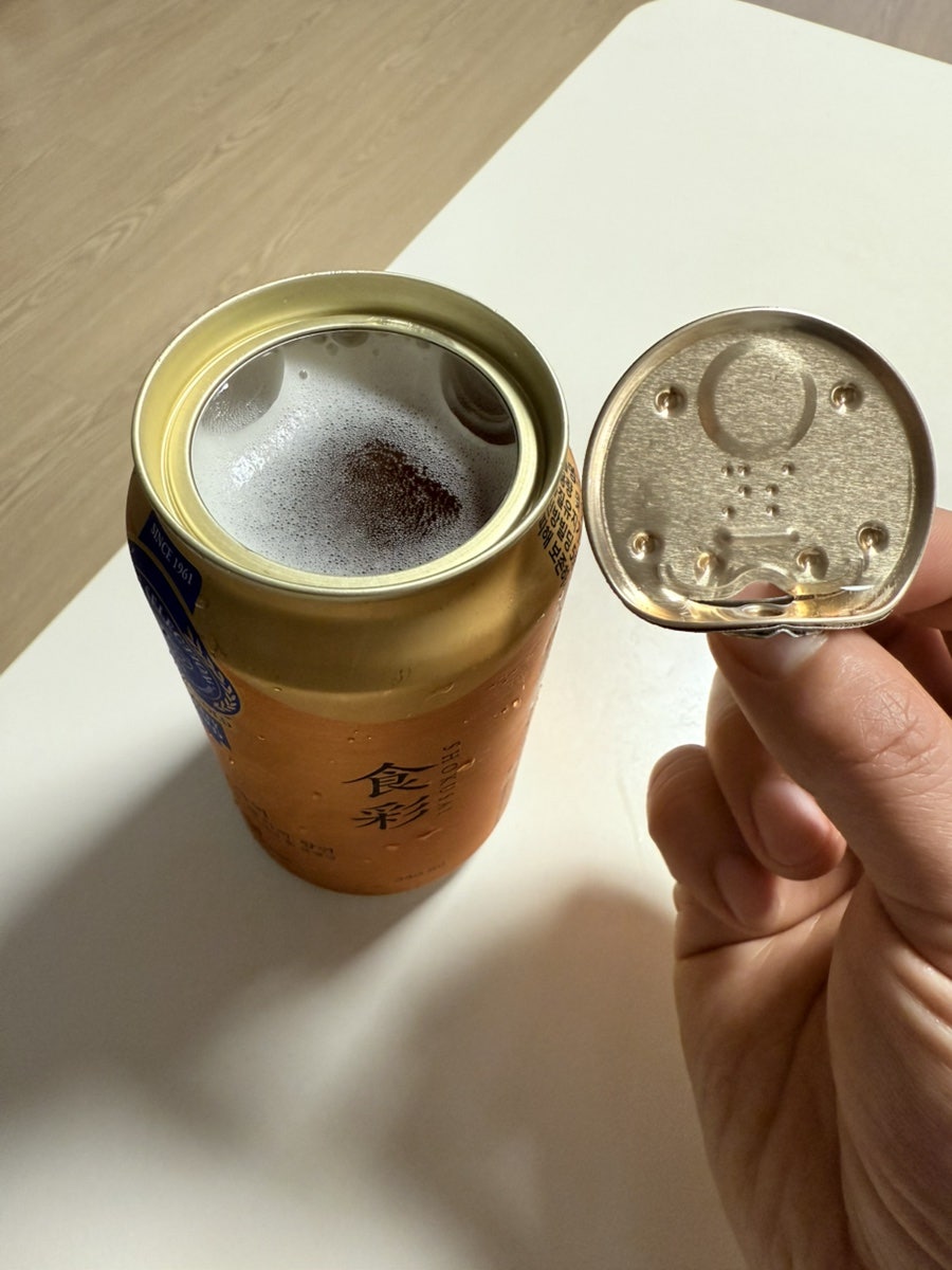아사히쇼쿠사이맥주 또 다른 특징이 풀오픈캔이라는 점입니다. 일반 캔 맥주처럼 뚜껑 딸때 살짝 따는 게 아니고 뚜껑이 통째로 열면서 자연스러운 거품이 위로 올라오는 방식입니다.