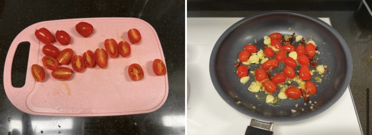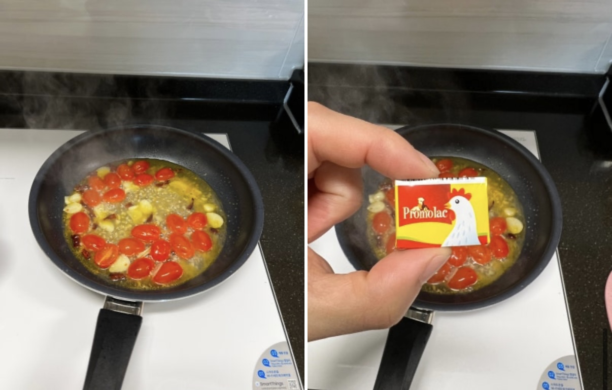 그리고 단맛을 위해 방울토마토를 반으로 잘라 추가로 넣어 줍니다. 방울토마토 반으로 잘 썰면 방울토막토 아닌가 살짝 한번 생각해 봅니다.