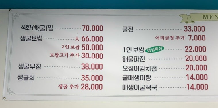 주요 메뉴와 가격은 석화찜 70000원 그리고 생굴보쌈 66000원입니다.