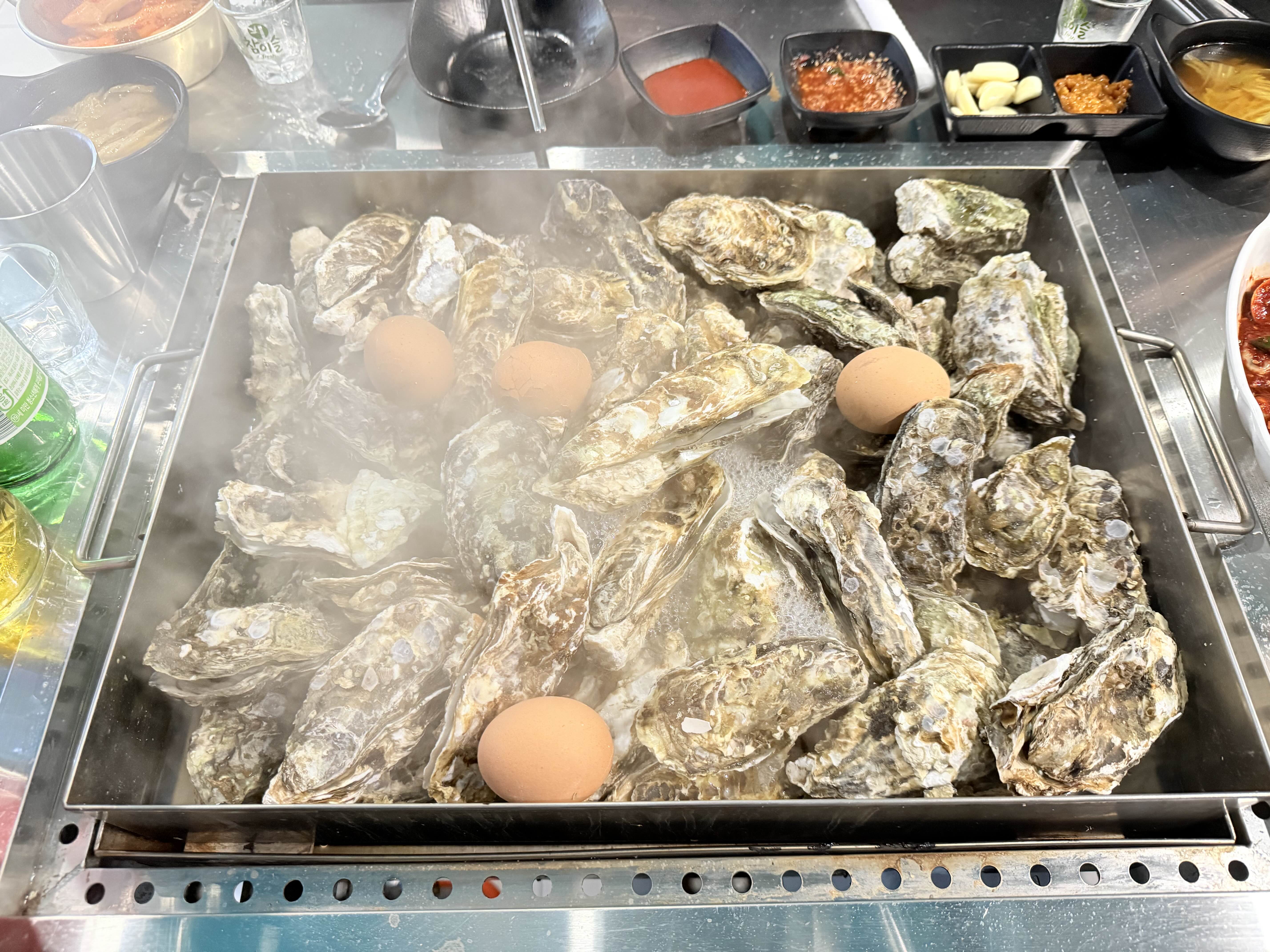 커다란 찜통안에 가득 담긴 석화들의 자태에 함께 나온 계란이 포인트가 되어 있습니다.