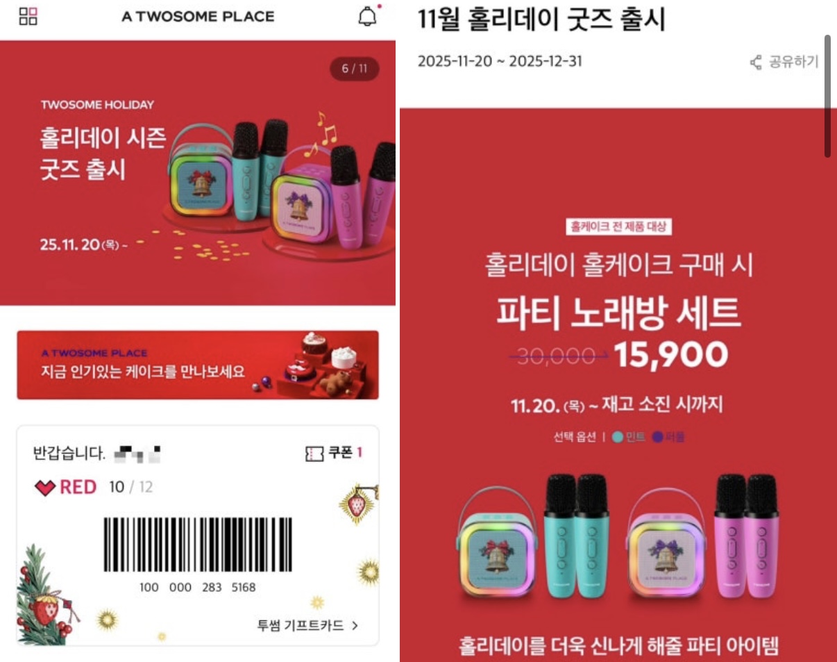 이번 투썸 홀리데이파티노래방세트가 디자인부터 기능까지 연말 분위기에 완벽하게 부합하는 아이템입니다. 친구들과 홈파티나 가족 모임 혹은 혼자 스트레스를 풀고 싶을 때는 언제나 활용하기 좋아 강력하게 추천드립니다.
