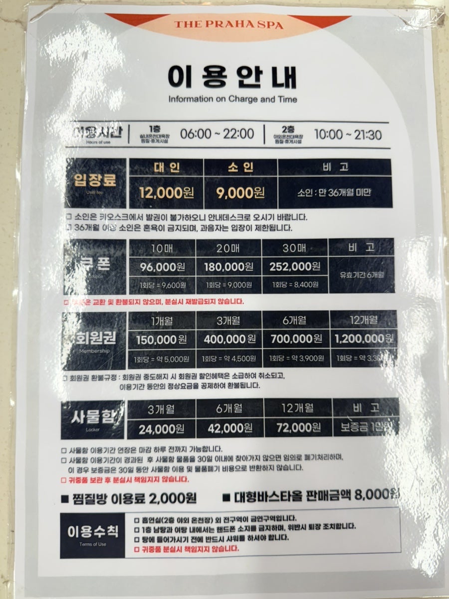 사우나 입장료 : 대인 12000원, 소인 9000원
