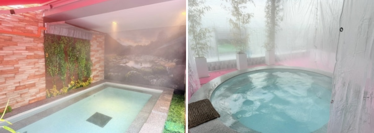 먼저 소자와 중자 사이즈 크기의 노천온천탕입니다. 소자의 경우 비닐로 노천탕 사방이 막혀있어 추운 날씨에도 바람을 막아주고 온도도 잘 잡아줍니다.