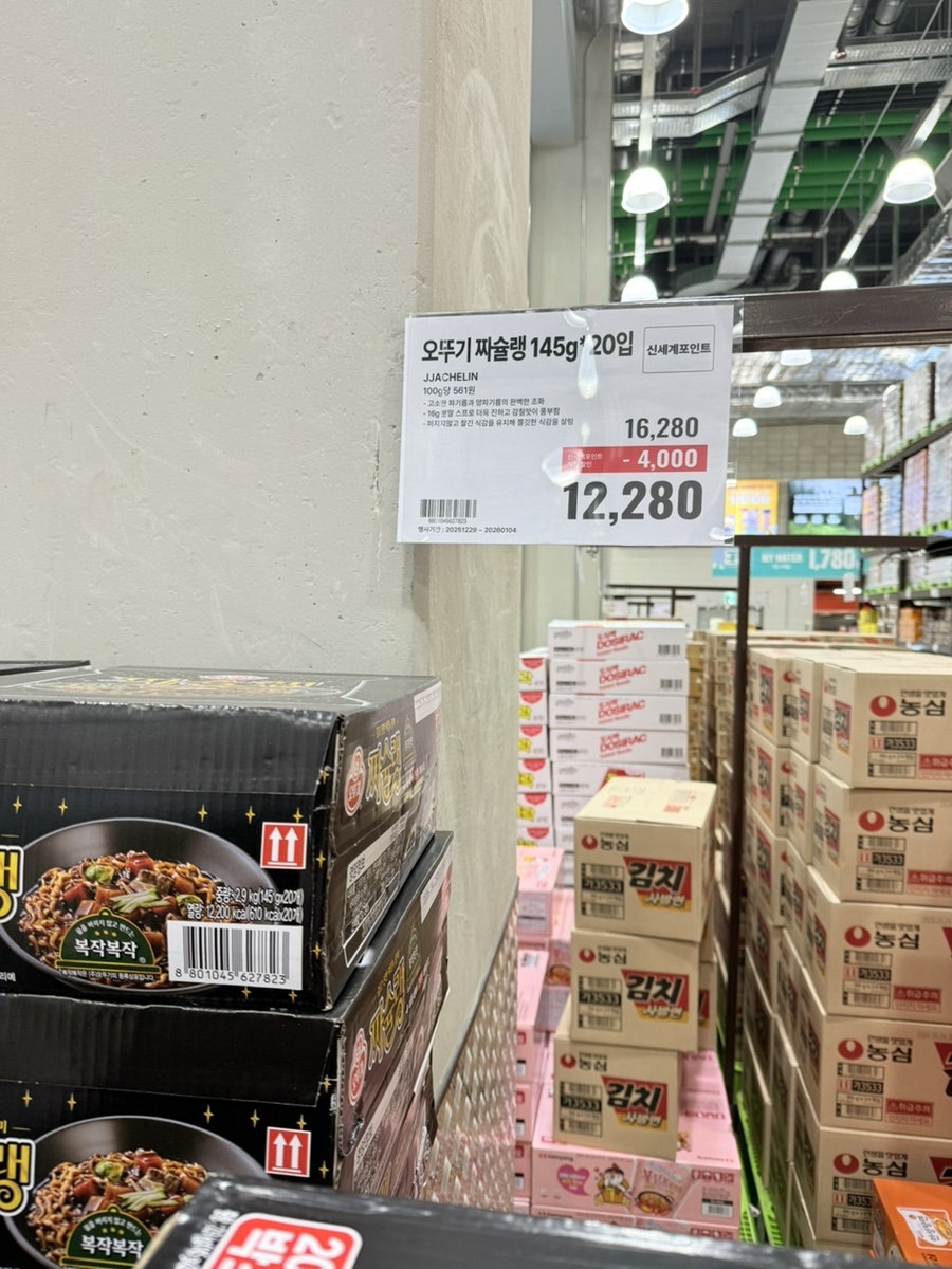 짜슐랭 20개 가격 16280원에서 4000원 할인된 12280원입니다. 사실은 라면 가장 저렴하게 구매 방법은 이마트에서 라면 행사를 할때 봉지라면 3봉다리에 9900원에 판매 할때 쟁여두는 방법입니다.