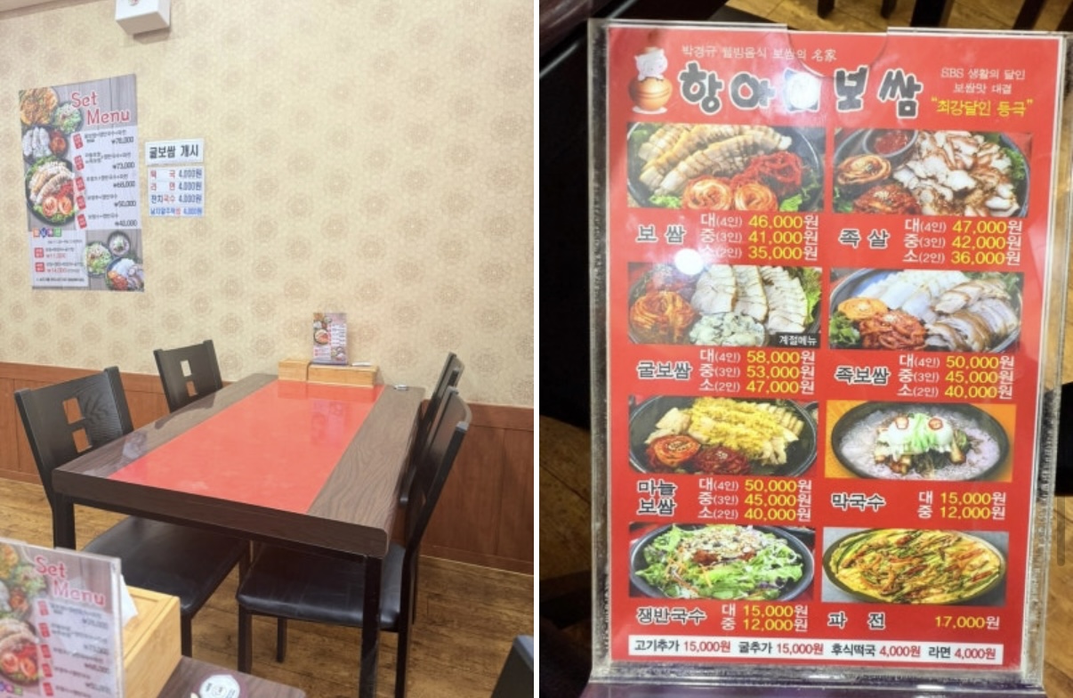 왠지 중국집스러운 느낌의 테이블과 벽지 그리고 메뉴판입니다. 항아리보쌈이 SBS생활의 달인 보쌈맛 대결 최강달인 등극했던 식당이라고 합니다.