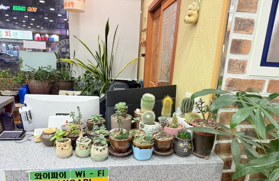 식당이나 가게 어느 곳 가도 식물 중품 이상을 여러개를 잘 키우는 곳은 최소한 실패가 거의 없는데 여기 입구쪽에 파키라를 비롯하여 여러 다육이 식물까지 잘 키우시고 계셨습니다.