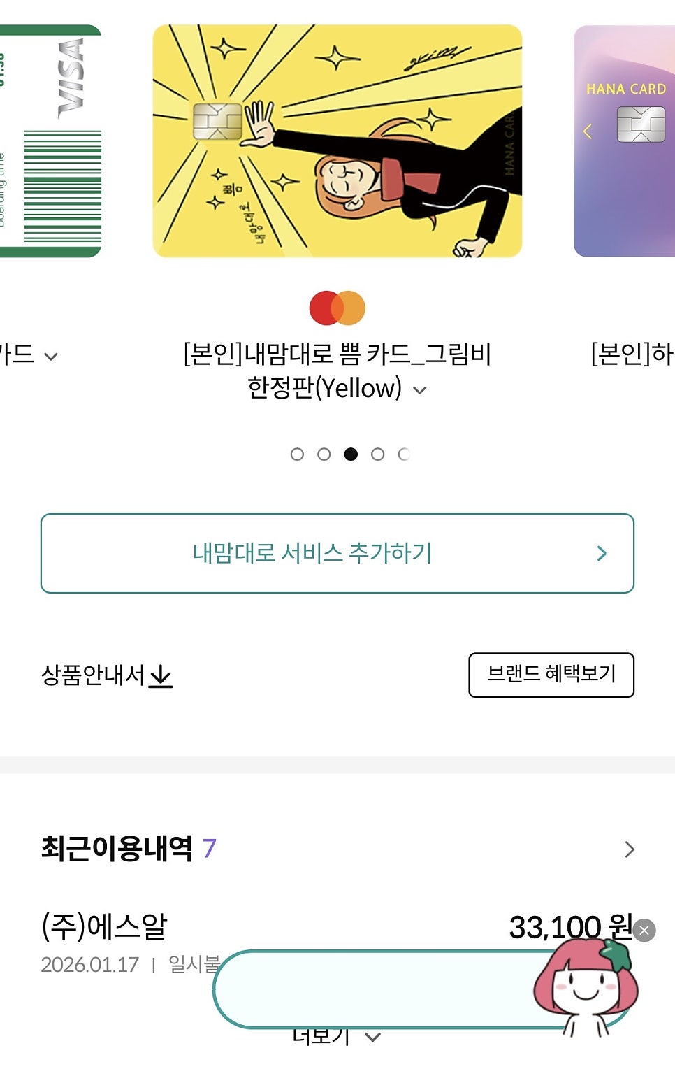 단점으로는 카드 디자인이 조금 구리지 않나 생각이 됩니다. 내맘대로 쁨 좋기는 하지만 뭔가 골드바를 들고 있는 느낌과 그리고 저 같이 k아재가 쁨카드를 내기에는 약간 부끄러운 느낌이 가끔 들때도 있습니다.