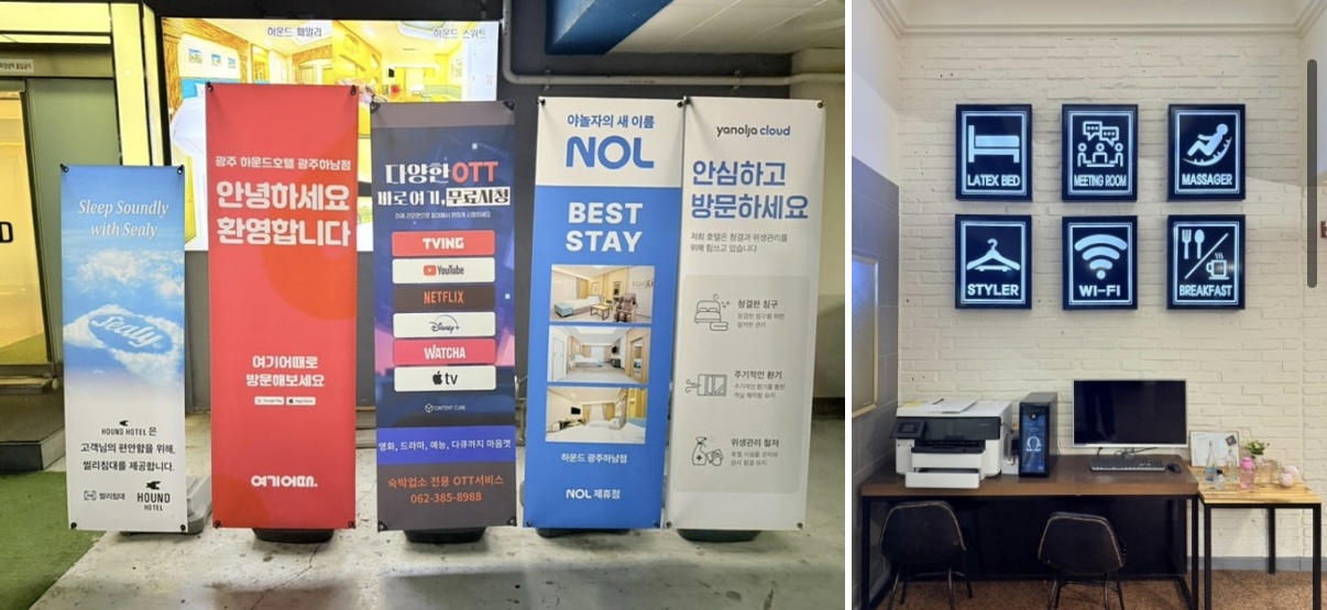 호텔 입구에 들어서면 직관적인 아이콘 침대, 스타일러, 와이파이, 조식과 안마의자 등이 있다는것을 알수 있습니다.