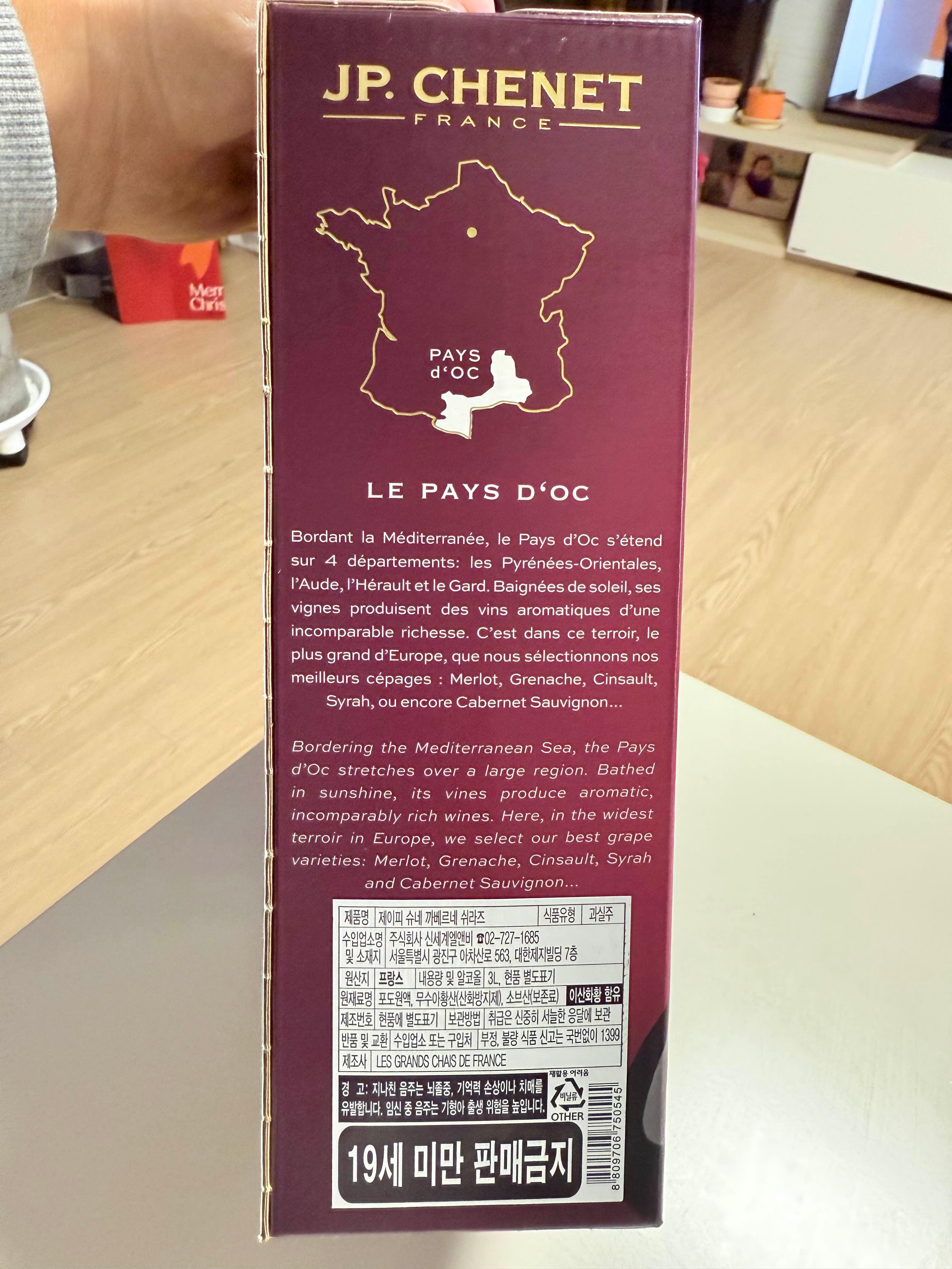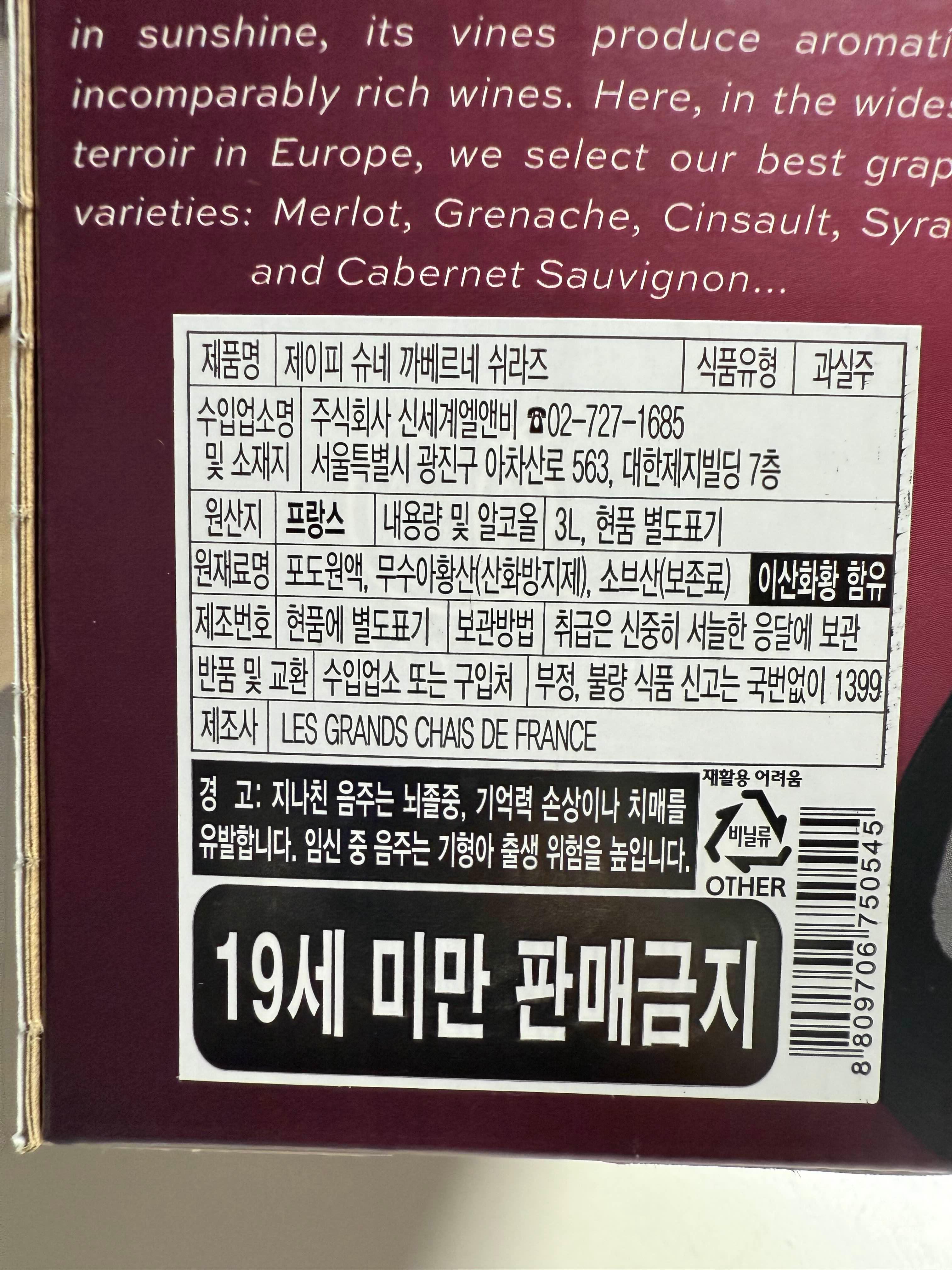 제품명 제이피슈네까베르네쉬라즈로 수입업소는 신세계엘엔비입니다. 원산지가 프랑스 와인으로 용량이 3L입니다.