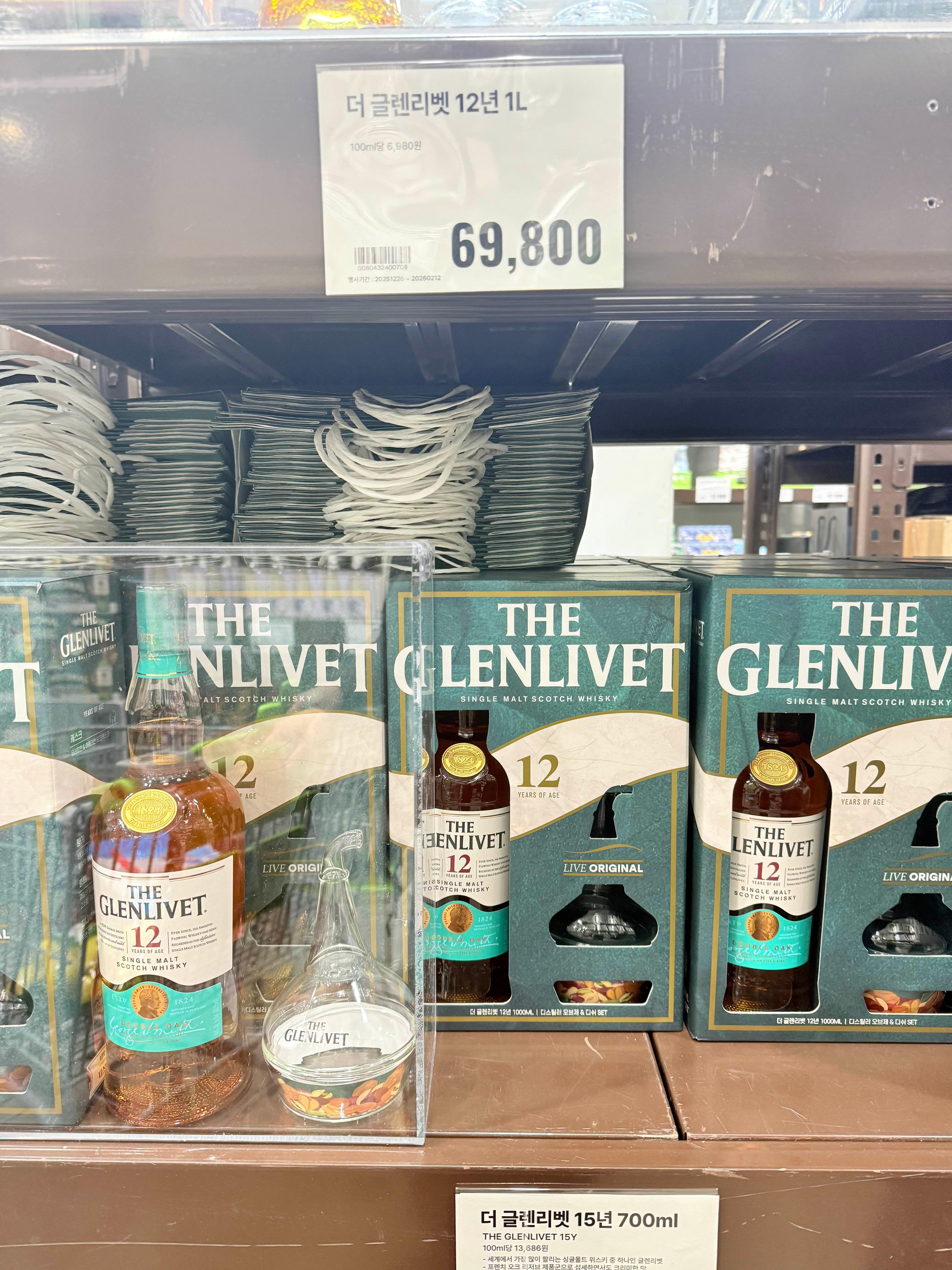 제가 좋아하는 위스키 더글렌리벳12년 가격 69800원입니다. 이게 증류기 모양의 디쉬세트와 같이 있어 제가 알던 시세보다 약간 더 가격이 있는거 아닌가 했었는데 용량이 1리터입니다.