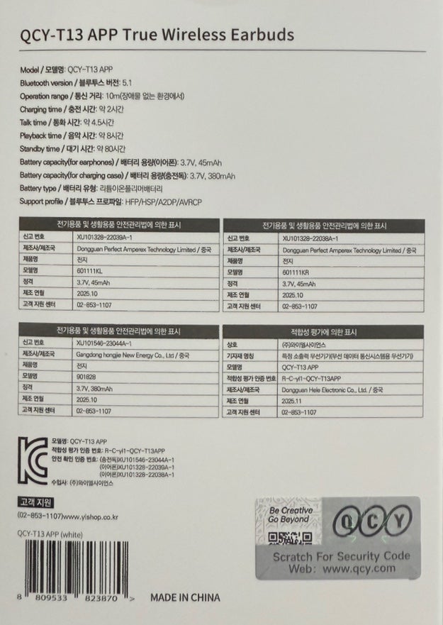 박스 뒤에 QCY-T13 APP true wireless earbuds 설명서로는 통신거리 10m 그리고 음악시간 8시간이라고 하니 하루 종일 이걸 써도 문제가 없는 수준입니다.