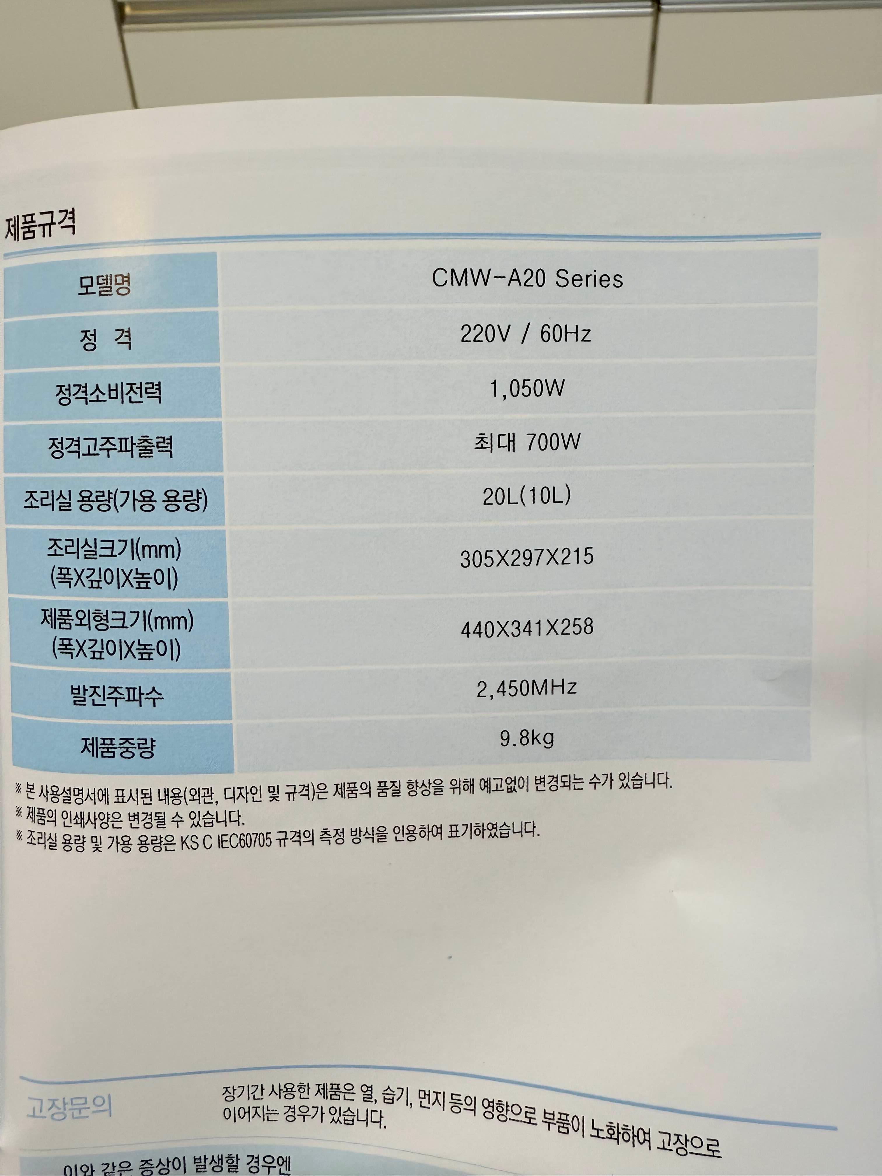 앞서 말씀을 드린대로 모델명이 CMW-A20 Series 이며 다른건 이미 말씀을 드렸고 제품 중량 9.8kg입니다.