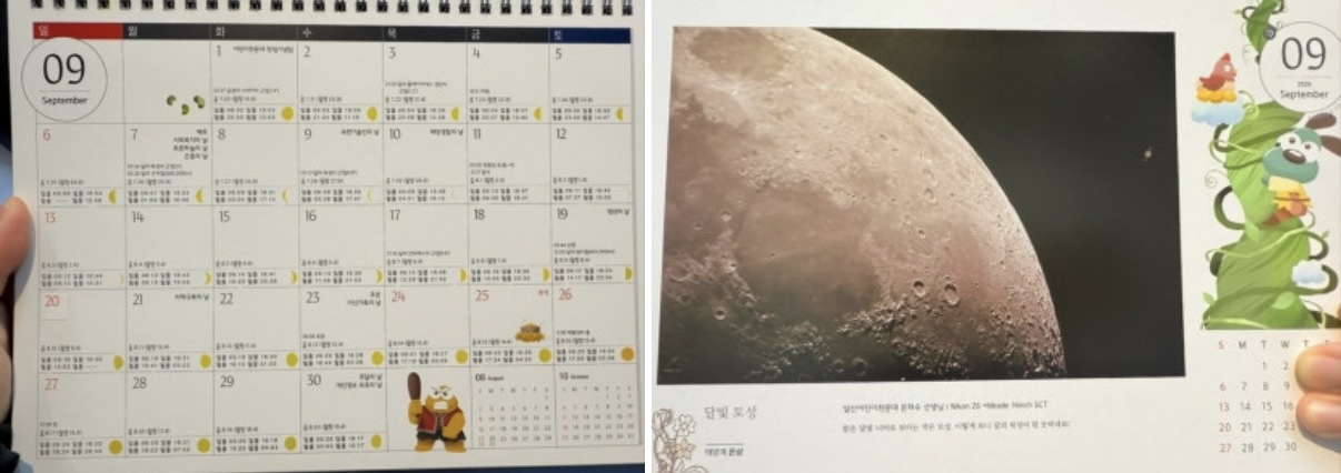 이 천체 달력이 그냥 날짜만 있는것이 아니라 달 모양이나 주요 천체 이벤트와 별과 우주에 대한 설명과 사진이 있습니다.