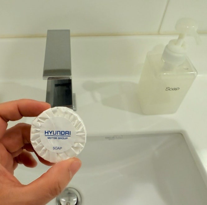 그리고 현대차굿즈 느낌이 나는 작은 비누와 손 씻는 물비누도 준비가 되어 있습니다. 나는 하루 쯤이라면 클렌징폼 안써도 된다고 생각을 하시면 진짜 딱 면도기, 칫솔과 치약만 챙겨오시면 되기는 합니다.