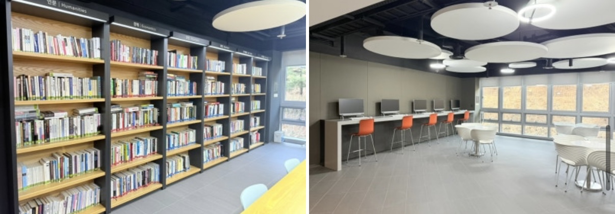 층수마다 약간 컨셉이 다르며 이렇게 인문, 경제 등 책장이 있는 휴게실과 그리고 대부분 스마트폰을 쓰기 때문에 이제는 pc를 쓰는 사람이 없겠지만 컴퓨터가 있는 장소도 있습니다.